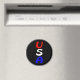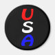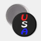 "USA", la abreviatura de los Estados Unidos de América, en letras brillantes rojas, blancas y azules contra un imán negro.