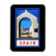 Ilustracion de turismo de vintage y publicidad de viajes para España, con arquitectura y velero cerca de la playa. Añadí bordes de diseño gráfico de colores cuidadosamente diseñados.