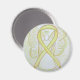 El imán de ángel de la guarda presenta la pintura de un ángel de cinta amarilla. El arte de la cinta de ángel de la conciencia amarilla se puede personalizar con mensajes personalizados para hacer imanes de gran causa para recaudadores de fondos, regalos de concientización u otros eventos o ocasiones especiales.