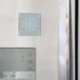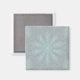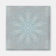 Pintura abstracta de rayas azul claro sobre un fondo gris plateado con resaltados blancos, modificada a un diseño caleidoscopio, impreso en imanes.