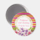Un imán de agradecimiento de cumpleaños con un elegante patrón compuesto de rayas horizontales rosadas, naranjas y de oro falso. Encaramado sobre la parte superior hay un marco con un borde dorado decorativo. El diseño está decorado con grandes flores de magnolia de color rosa y púrpura y con toques verdes. Personalice el texto de su evento.