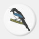 Dibujo de una Magpie con el distintivo flash azul de color, y las marcas blancas - encaramadas en una rama. Un pájaro astuto con mucho folclore refiriéndose a él. Un diseño divertido para los fans de la revista.