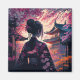 Generadores de computadoras diseñan einer Geisha en einem Kirschblüten Zauber. Abbildung einer Frau mit einer hübschen Hochsteckfrisur und Blüten im Haar welche einen Kimono trägt. Japanisches Design im AI - Estilo de viaje medio. Soy Hintergrund Japanische Gebäude.