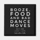 Moderno y elegante ahorra imanes de citas para la pareja que adora la diversión y que no puede esperar a anunciar su cita de boda a su familia y amigos. Diseño de tipografía en blanco y negro que dice: Booze, comida y movimientos de danza mala. Personalizar con sus nombres y fecha de boda.