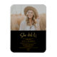 Impresiona con estos guiones de caligrafía cardíaca brillantes dorados, clase de 2022, imanes de invitación a fiesta de graduación sobre un fondo negro. Personaliza fácilmente con tus detalles importantes en la parte delantera y tu foto en la parte posterior de la tarjeta. Ideal para eventos de alto nivel y colegiados.