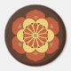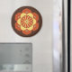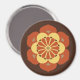 Imán redondo de diseño de mandala japonesa que representa una flor de loto estilizada, simbolizando la pureza, el despertar espiritual y la fidelidad - flor en naranja de óxido / terracota y amarillo dorado, acentuado con el color tostado, sobre un fondo marrón chocolate oscuro