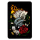 Arte vectorial original de una mano sosteniendo cartas de juego que están en llamas. Con monedas de oro, dados, 8 bolas, Ribbon y un rosa.
