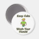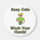 El diseño "Keep Calm and Wash Your Hands" incluye un mensaje de consejo y un gráfico de una persona sensata y fresca que se lava las manos. ¡Mantente tranquilo y practica la buena higiene de la mano!