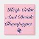 ¡Mantente tranquilo y bebe champán! Grabado azul en un fondo rosado con burbujas amarillas.