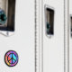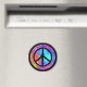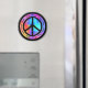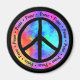 Señal de paz distorsionada en un fondo multicolor con texto alrededor.