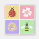 Las plazas rosadas, amarillas, violetas y verdes pasteles están adornadas con rodajas, flores de madera de palo, margaritas y abejas y bordeadas de un puntito blanco apretado para crear un divertido y dulce patrón al estilo de los parches de primavera.