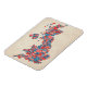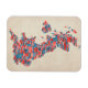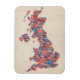 Mapa de texto tipográfico de Gran Bretaña que muestra más de 400 ciudades y pueblos dentro del Reino Unido, en rojo y azul sobre un fondo vintage.