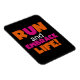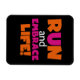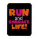 Camisetas de texto Run and Embrace Life, caramelos, imanes, mousepads, tarjetas, pegatinas, llaveros, botones, imanes, placas y servilletas de papel, bolsas de regalo, latas de caramelo, relojes y muchos otros artículos con un diseño rosa y naranja brillante. Estos productos temáticos hacen grandes regalos para cualquiera que corra por diversión, corre por pista, maratones, media maratón, 10Ks o 5Ks!