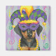 Cute Doberman Pinscher Puppy, vestido con máscara festiva, gorra de bufón y cuentas, listo para divertirse en el Mardi Gras o en cualquier otro momento. Excelente regalo para ti y para tu familia y amigos amantes de Dobe.