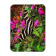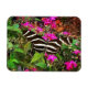 La Mariposa Zebra Longwing. (Heliconius Charithonia (Linnaeus). Mariposa Estatal de Florida. Una de las mariposas más bellas. Con sus alas alargadas negras, rayas blancas. Vuelan con gracia. Su planta anfitriona es la flor violeta de la pasión. Se comen las hojas y el polen. El polen les ayuda a vivir más que la mayoría de las mariposas. Meses. Las mujeres plantan sus huevos amarillos en las hojas. Este está obteniendo néctar de una flor rosa de lantana. ¡Hermosa fotografía en los imanes de mi tienda! Copyright Fotografía de Deborah Carr.