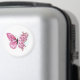 Arreglo floral de mariposa rosa con flores japonesas de cerezo rosadas sobre fondo blanco.