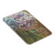 Una boda salva el imán de fecha con una foto de hortensias azules y púrpura en un frasco de albañil sobre un fondo de madera de granero.