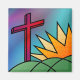 Un diseño de vidrieras que ilustra la mañana de Pascua, con una cruz roja parada en las verdes colinas junto a un ardiente amanecer.