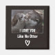 Un imán con una foto linda y romántica con dos nutrias enamoradas. Una nutria está lamiendo y besando la cara de la otra, los ojos cerrados parecen alegres. El texto dice "Te amo como ninguna nutria" con un lindo corazón de doodle. Sobre un fondo marrón oscuro.