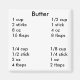 La mantequilla es grandiosa pero a veces no es posible simplemente usar un palo en una receta. A veces tenemos un palo parcialmente usado o hacemos medio lote de algo, o tal vez compraste 1 libras de bloques, o tal vez tienes una bañera. Poder medir la mantequilla de diferentes maneras puede hacerlo un poco más fácil. He incluido onzas así como tazas, cucharadas soperas, y cómo se relacionan con palos de mantequilla. Con este imán frigorífico ahora puedes tener la información que necesitas a mano cuando lo necesites.