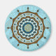 Esta mandala azul y de cobre se inspiró en los medios indios y los disfraces de anime japonés. Cuenta con capas con pétalos de loto, hojas, paisajes y una rueda ornamental alrededor de todo.