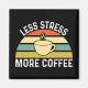 A cualquiera que le guste el café y sepa el efecto que tiene en su nivel de estrés le encantará este diseño de café de estilo retro en bolsas, tazas, pegatinas, camisetas, almohadas y más con una taza de café humeante con un texto que diga Menos estrés más café.