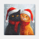 Una escena caprichosa y festiva llena de alegría navideña y amor por un felino negro feliz y un gato naranja, ambos con sombreros de Santa, rodeados de copas de nieve cayendo.