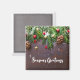 Imán con una fotografía rústica de una mesa de madera marrón con pinecones, agujas de pino, nieve y adornos navideños. Festiva y encantadora.