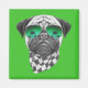 Este diseño presenta un retrato de pug con gafas de sol y una bufanda a cuadros en blanco y negro.
