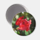 Imán minúsculo de la Rosa Roja. Una rosa roja en miniatura de bonito está a punto de abrirse cubierta de gotas de lluvia de primavera frescas que caen por sus pétalos suaves. Un hermoso regalo para los aficionados a la fotografía rosa, el arte floral y el diseño floral.