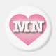 Este imán presenta un corazón rosado con un centro encalado, dominado por las letras mayúsculas MN, la abreviatura oficial de Minnesota, el estado de la estrella del norte.