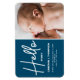 Personalizar esta tarjeta magnética de anuncio de nacimiento de bebé con las fotos y detalles de su hijo. Ser una tarjeta magnética es una manera fácil para que la familia y amigos puedan mostrar y apreciar este momento especial. La palabra 'Hola' contra un fondo azul moderno con el nombre del bebé y estadísticas de nacimiento.