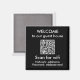Moderno imán de refrigerador QR en negro con información wifi de una casa de huéspedes, casa de alquiler o Airbnb. Personalízalo con un enlace directo escaneado y la red y contraseña.