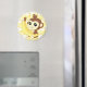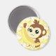 Un mono muy lindo y kawaii sosteniendo un plátano, el fondo en tonos amarillos y patrón bananero. En un imán