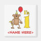 Un mono gracioso y gracioso vestido con un gorra de primer cumpleaños sosteniendo un plátano y un globo rojo parado al lado de un enorme número 1.