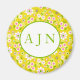 El diseño de fondo luminoso y soleado presenta flores blancas con centros rosas y verdes sobre fondo amarillo. Personalizar con monograma o nombre en oval blanco y verde