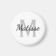 Monograma blanco y negro personalizado pequeño imán de nevera redonda. Elegante plantilla de tipografía de guión para nombre o apellido. Clásico favor de fiesta o idea de regalo para amigos, familia, compañero de trabajo, clientes, empleado, clientes, visitantes, bodas invitados, etc. Agregue su propio nombre comercial opcionalmente. Ideal para cumpleaños, fiesta de bodas, evento de negocios corporativos y más.