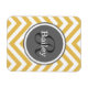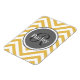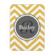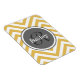 Patrón de zigzag de chevron blanco y amarillo monogramado con nombre personalizado. Diseño geométrico moderno, elegante y elegante, con una placa con el nombre de un círculo gris que se personaliza fácilmente con el nombre y apellido de la letra inicial.