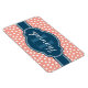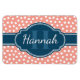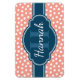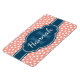Patrón de puntos rosa y blanco claro y moderno en el fondo, coronado por una etiqueta azul oscuro con un nombre de personalizable y una plantilla de monograma.
