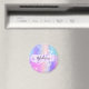 Magnético y lindo imán con un colorido color rosa, púrpura, lila, azul y verde corazones de arco iris unicornio brillantemente fondo. El nombre y el monograma personalizados están escritos en un guión elegante con letras a mano con un fondo de rastrillos de pincel de unicornio púrpura lila. ¡Un regalo perfecto de cumpleaños o Navidades!