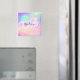 Magnético y lindo imán con un colorido fondo de arcoiris rosa, melocotón, púrpura, lila, azul y verde de unicornio. El nombre y el monograma personalizados están escritos en un guión elegante con letras a mano con un fondo de rastrillos de pincel de unicornio púrpura lila. ¡Un regalo perfecto de cumpleaños o Navidades!