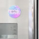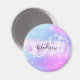 Magnético y lindo imán con un colorido color rosa, púrpura, lila, azul y agua unicornio corazones arcoíris brillantes fondo. El nombre y el monograma personalizados están escritos en un guión elegante con letras a mano con un fondo de rastrillos de pincel de unicornio púrpura lila. ¡Un regalo perfecto de cumpleaños o Navidades!