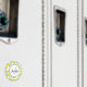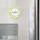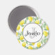 Un imán personalizado con un nombre y un monograma inicial en un círculo blanco con un borde de cuerda. Diseñado con limones amarillos y hojas verdes, en un patrón de repetición.