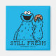 Monstruo de las Galletas sosteniendo su snack favorito incluyendo la frase "aún fresco". © 2021 Sesame Workshop. www.sesamestreet.org
