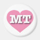 Este imán cuenta con un vibrante corazón rosado que contiene las letras atrevidas, blancas y altas del funda MT, la abreviatura oficial de Montana, el estado del tesoro.