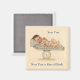 Un bebé adorable con grandes sonrisas está tendido sobre balanzas cubiertas de mantas. Tonos azul y melocotón suaves. Personalizar para anunciar el nacimiento o repartirlo como anuncios de nacimiento. Más regalos de personalizable con este diseño en mi galería.