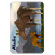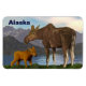 Una mami mamá y su lindo ternero con un lago y montañas a lo lejos. También aparece el texto "Alaska".
