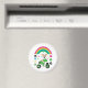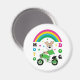Un perro lindo en una motocicleta rodeado de un arco iris colorido y estrellas, diseño para los niños