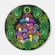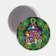 Un imán con coloridas setas psicodélicas rodeado de paisajes verdes y mandalas verdes.