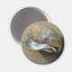 Una concha de mejillón descansa en la playa de arena con una suave iluminación lateral desde la puesta de sol. La luz capta las grietas rotas que han sido usadas por el océano. Desde el ángulo, el caparazón toma la apariencia de un perfil de cabeza de águila donde el armazón del caparazón tiene una estructura similar a un pico. La imagen es una fotografía a color tomada en Playa Grande, Costa Rica en la costa del Pacífico. Personalizar este imán de playa de conchas marinas con tu propio texto o imágenes para hacer un regalo especial de la concha de mar!